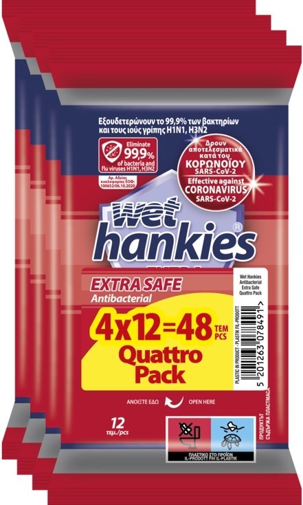 WET HANKIES ΥΓΡΑ ΜΑΝΤΗΛΑΚΙΑ ANTIBACTERIAL 4×12ΤΕΜ EXTRA SAFE 24ΑΔΑ