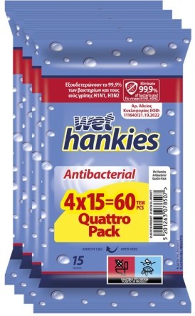 WET HANKIES ΥΓΡΑ ΜΑΝΤΗΛΑΚΙΑ ANTIBACTERIAL 4x15TEM 24ΑΔΑ